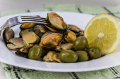 przekąska małże i cytryna na talerzu na białym tle