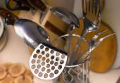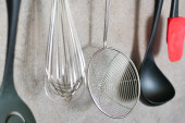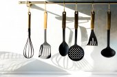 Zdjęcie "Widok z bliska na różne naczynia wiszące w kuchni " może być wykorzystywane do celów osobistych i komercyjnych zgodnie z warunkami zakupionej licencji Royalty-free. Obraz jest dostępny do pobrania w jakości wysokiej rozdzielczości do 5760x3840.