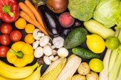 Widok z góry warzyw i owoców z chlebem na drewnianym stole