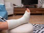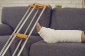 Młody mężczyzna ze złamaną nogą, siedząc na kanapie, trzymając zdalnego