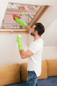 Młody mężczyzna woźny czyszczenia parapet z gąbką w salonie