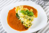 apetyczny część lasagne na białym talerzu z sosem pomidorowym