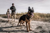stalker z maska gazowa w ręce i pies, przyjaciół w post apokaliptycznym świecie. Styl życia po Apokalipsie na ruiny, koncepcja doomsday