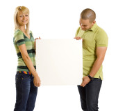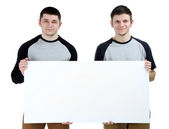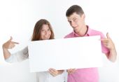 Młoda para przytrzymanie puste plakat na białym tle