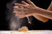 Dokonywanie ciasta przez kobiece dłonie w domu w kuchni