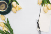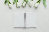 Widok z góry białe tulipany, wstążki i ramka na tle czarne damskie powierzchni, Międzynarodowy Dzień