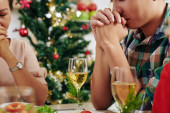Wykadrowanego obrazu osób siedzi przy stole i przywitanie nowego roku