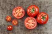 świeże pomidory i pomidorkami na winorośli na tle metal nieczysty