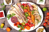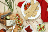 Zdjęcie "Chleb rolki na pokładzie z tapas i pinxos z szynki prosciutto, ser feta, oliwki i czosnek - z lewym górnym rogu przestrzeni kopii" może być wykorzystywane do celów osobistych i komercyjnych zgodnie z warunkami zakupionej licencji Royalty-free. Obraz jest dostępny do pobrania w jakości wysokiej rozdzielczości do 5760x3840.