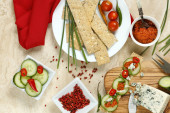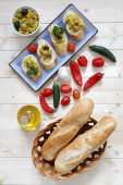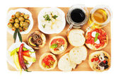 Chleb rolki na pokładzie z tapas i pinxos z szynki prosciutto, ser feta, oliwki i czosnek - z lewym górnym rogu przestrzeni kopii