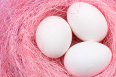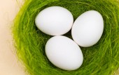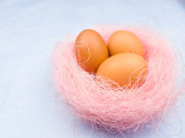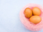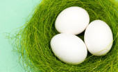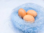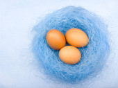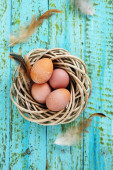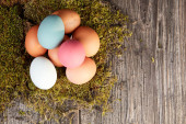 Kolorowe pisanki w zielone gniazdo na pastelowe niebieskie tło. Z bliska.