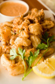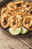 Kalmary, smażone kalmary z cytryną. Hiszpański jedzenie.