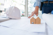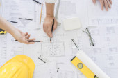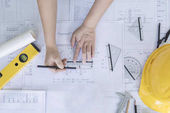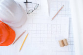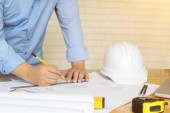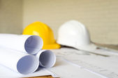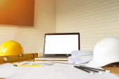 narzędzia inżynierskie i kask na planach w biurze, koncepcja budowy. Koncepcja inżyniera