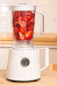 świeże truskawki w biały blender na drewnianym stołem