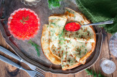 Naleśniki z koperkiem na metalowej tacy z czerwonym kawiorem, widok z góry