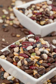 Zamknij się obraz różnorodnych fasoli na misce biały