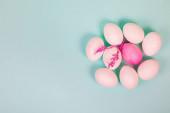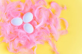 Różne kolory pisanek, Jaja przepiórcze i białe pióra na pastelowy różowy tło, widok z góry, płaskie świeckich. Koncepcja Wakacje Wielkanoc.