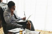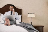 Skadrowana biznesmen picie whisky i działa na laptopie w pokoju hotelowym