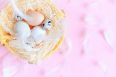 Pisanek w różnych kolorach, Jaja przepiórcze i białe pióra na żółtym tle, widok z góry. Koncepcja Wakacje Wielkanoc. Z bliska.