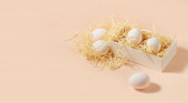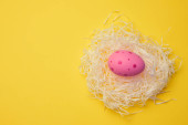 Biały Pisanka w wiklinowym koszu na różowym tle, widok z góry, z płaskim leżał. Koncepcja Wielkanoc.
