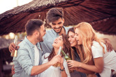 Szczęśliwa dziewczyna patrząc na tort urodzinowy, otoczony przyjaciółmi na imprezie