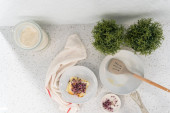Widok z góry ciasta na talerzu sztućce i roślina doniczkowa na szary