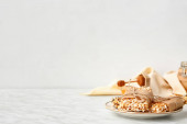 Widok z góry ciasta na talerzu filiżankę kawy i roślina doniczkowa