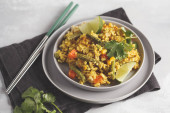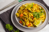 Curry wegetariańskie ryż z warzywami i kokosowy krem w bla