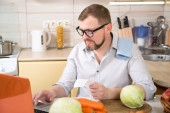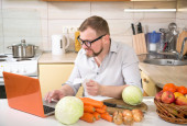 Mężczyzna siedzący przy stole w kuchni przed otwartym laptopa, skoncentrowane na papierkową robotę, płacenia rachunków krajowych, przy użyciu aplikacji bankowości online, planowanie budżetu domowego.
