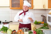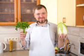 Człowiek w kuchni jest Przygotowanie sałatką ze świeżych warzyw. Potrawy wegetariańskie.