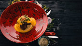 Sałatka z cielęciny z orzeszkami pinii i warzywa. Widok z góry. Ilość wolnego miejsca dla tekstu. Na tle drewnianych.