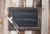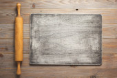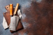 Rzeźnik. Sztuka mięsa noże i tablica. Widok z góry z miejscem na swój przepis