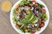 świeże sałatki, warzywa i ser biały w płycie na podłoże drewniane