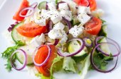 Sałatka wiosna świeży ogórek, pomidor, ser i rukolą, na białym tle na białym talerzu
