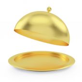 Biała ceramiczna taca z pokrycie złoty jedzenie na białym tle