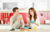 Zdjęcie "młoda para je śniadanie w kuchni" może być wykorzystywane do celów osobistych i komercyjnych zgodnie z warunkami zakupionej licencji Royalty-free. Obraz jest dostępny do pobrania w jakości wysokiej rozdzielczości do 5760x3840.