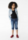 stylowe małe dziecko siedzi na czerwony sześcian na białym tle