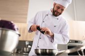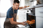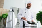 Widok z boku przystojnego mężczyzny gotowania makaronu w kuchni