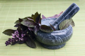 Zdjęcie "Świeże przyprawy i zioła w kamień zaprawy na zielonym tle. liście bazylii czerwony" może być wykorzystywane do celów osobistych i komercyjnych zgodnie z warunkami zakupionej licencji Royalty-free. Obraz jest dostępny do pobrania w jakości wysokiej rozdzielczości do 5760x3840.