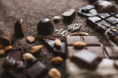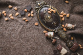 zbliżenie: słodka czekolada z suchych ziół i dekoracje w stylu vintage na brązowym tle
