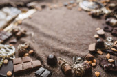zbliżenie, czekolady, z dekoracjami orzechy i kolczyki w stylu vintage na brązowym tle