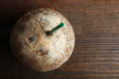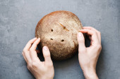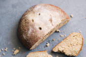 ciepłe, świeżo chleb żytni. Pokroić w plasterki. Oderwać kawałek. Widok z góry. Farm food wykonane z mąki i jaj.