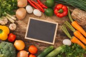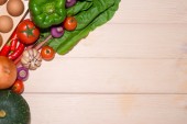Różnych świeżych warzyw na drewnianym stole. Widok z góry.