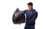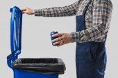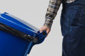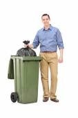 portret młodego Cleaner w mundurze z kosza, na szarym tle