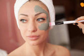Koncepcja spa. Młoda kobieta z odżywką maska twarzy w salonie piękności, zbliżenie