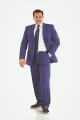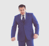 Szczęśliwy, biznesmen, stojąc na białym tle na białym tle.