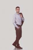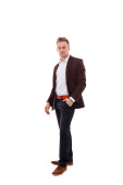 Szczęśliwy, biznesmen, stojąc na białym tle na białym tle.