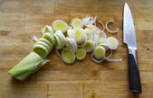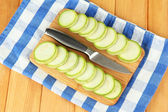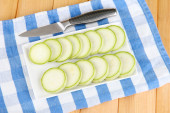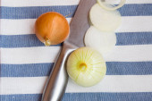 Cebula, pokrojona w plastry na pokładzie krojenia nożem, pasiasty serwetka