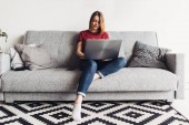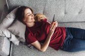 Młoda kobieta za pomocą inteligentnego telefonu podczas odpoczynku na kanapie w salonie