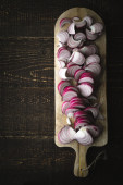Kolorowy, czerwoną kapustą i czerwonej cebuli ze szczypiorkiem na stół łupków